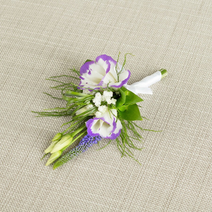 Our Refined Lilium & Lisianthus Groom Buttonholes are designed to add sophistication to any wedding ensemble. Featuring a stunning combination of White-purple Lisianthus, Purple Veronica, Gypsophila, and Aralia leaves, this arrangement offers a unique and elegant touch for every groom.