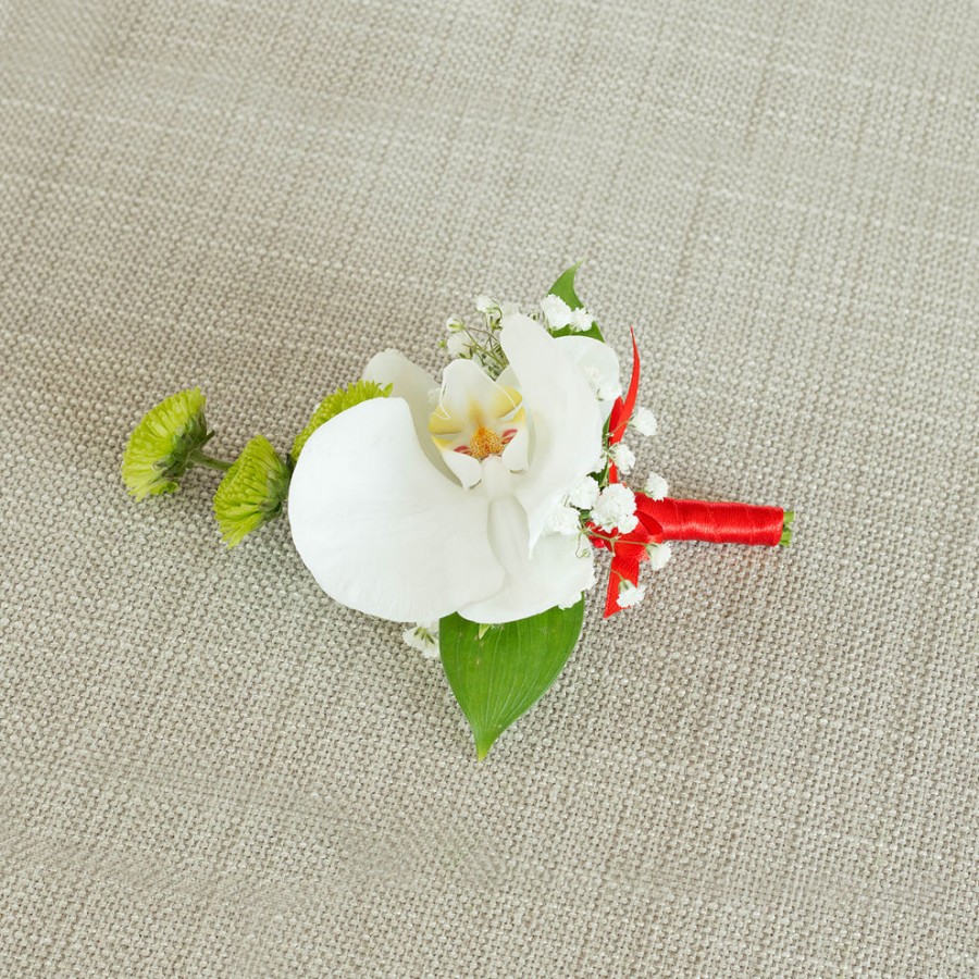 Complete the groom's attire with our exquisite buttonhole, featuring a harmonious mix of white orchids, green mini chrysanthemums, and gypsophila. Each bloom is hand-selected to ensure exceptional freshness and vibrant colors, creating a bouquet that radiates elegance and sophistication.