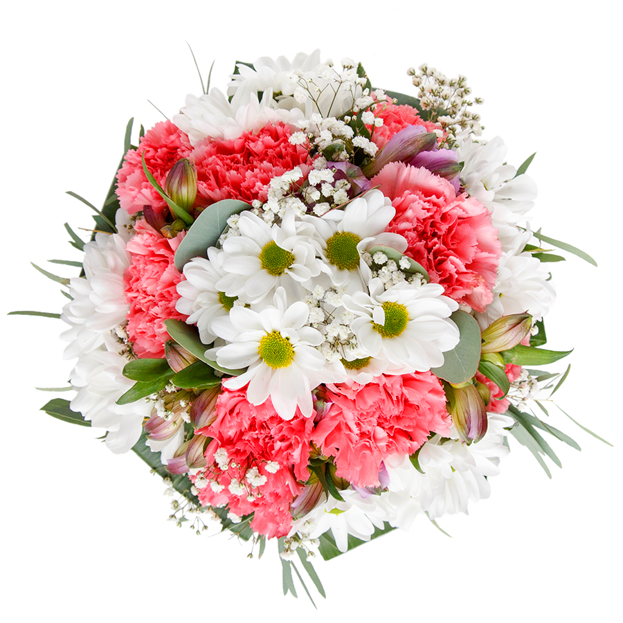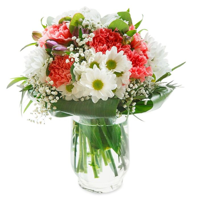 Brighten someone's day with our stunning seasonal mix of hand-selected flowers. This elegant arrangement features a harmonious palette of snow-white chrysanthemums, delicate gypsophila, and light pink carnations, artfully wrapped in lush aspidistra leaves.
